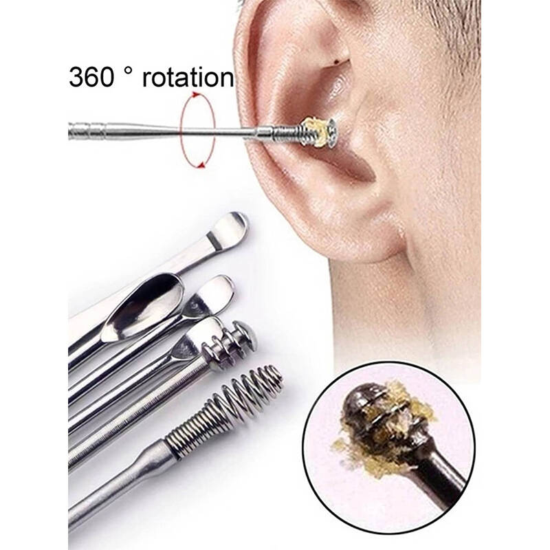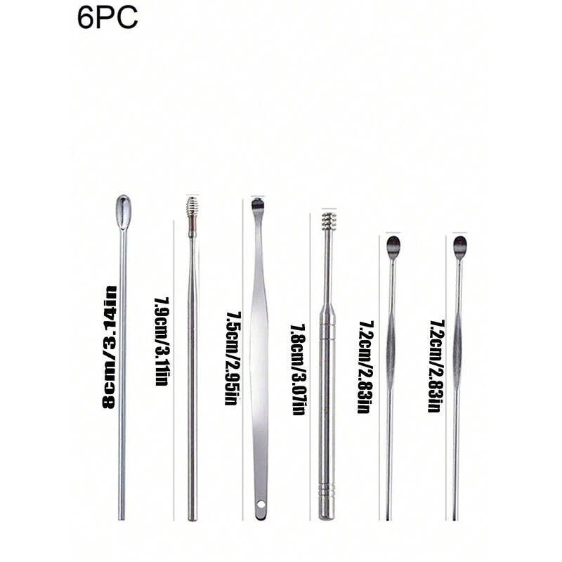 The set includes six uniquely designed stainless steel tools with spoon-shaped tips of various sizes. Each tool caters to different ear cleaning needs, ensuring thorough care and improved hygiene compared to disposable cotton swabs.